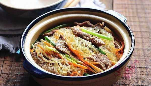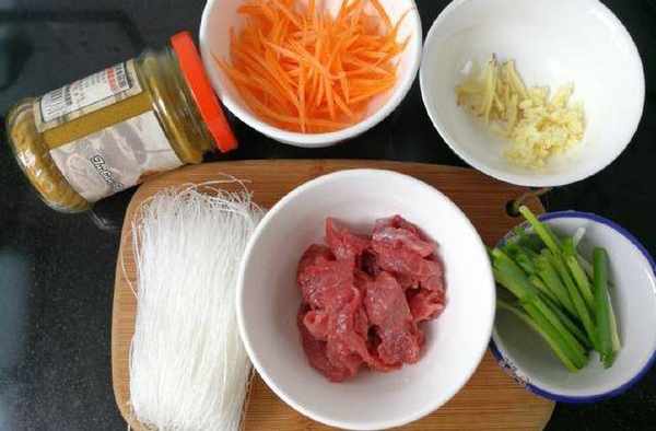 主料:牛肉100克,粉絲50克,蔥10克,胡蘿卜(紅)20克,薑6克,油10克,蒜泥5克
