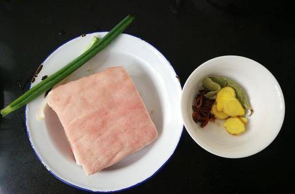 主材料:帶皮五花肉900克,小蔥10克,薑片10克,八角5克,小蘇打10克,香葉3克