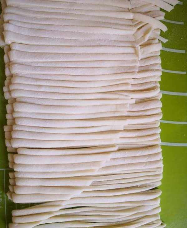 ⑤將面團搟成大薄片,再切成粗細均勻的細長條。