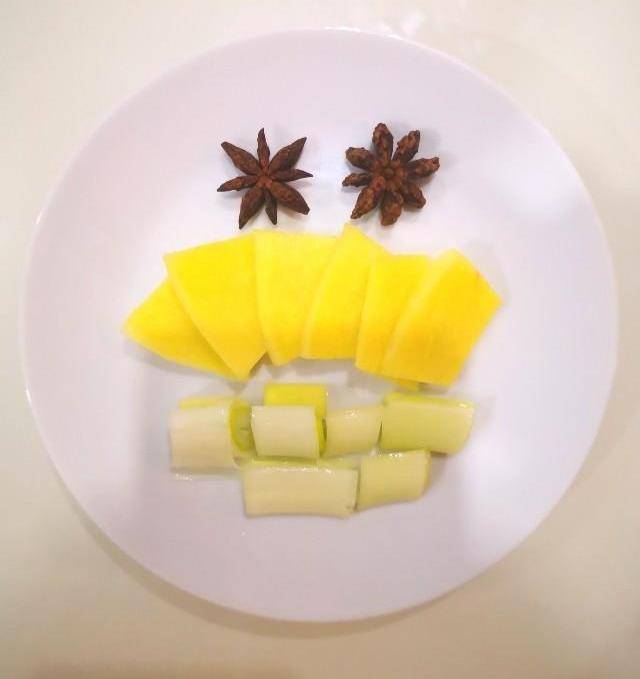 第三:豆角清洗幹凈,切斷;八角、蔥、薑清洗幹凈,切好備用。