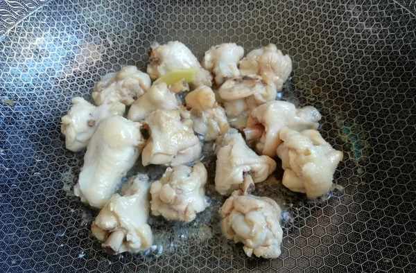3、熱鍋倒油,放入薑片煸香,再放入雞翅根煎至兩面金黃,淋入料酒炒勻。