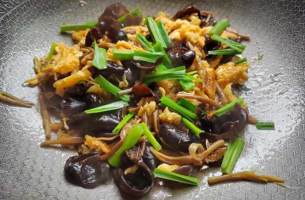 4、放入木耳和黃花菜爆炒一會,加入鹽炒勻,把雞蛋放回鍋中,再加入生抽和蒜苗炒勻,就可以出鍋啦!