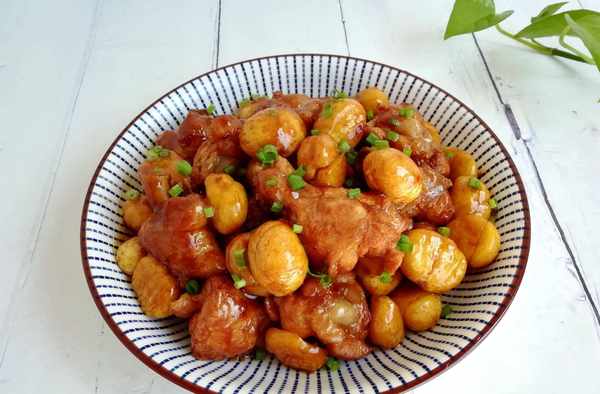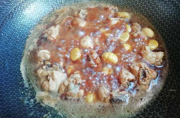 4、加入生抽、蠔油、紅燒醬油、冰糖炒勻,再倒入適量清水,中火燒10分鐘,再放入板栗,加入鹽炒勻,繼續燒10分鐘左右,把湯汁收幹一些,就可以出鍋啦!