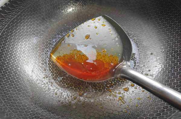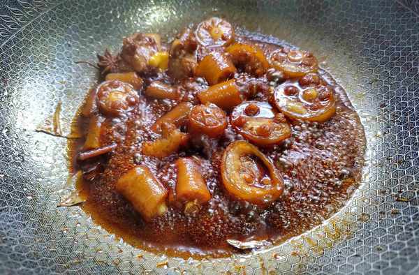 2、熱鍋燒油,放入冰糖,小火炒出糖色,再放入豬尾巴翻炒一會。