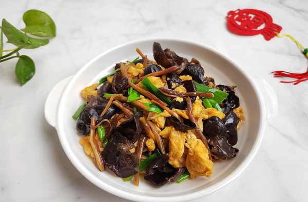 食材:黃花菜1把、木耳1把、土雞蛋3個、花生油40克、鹽2克、生抽10克、料酒10克、蒜苗少許。