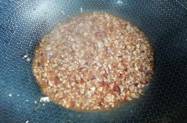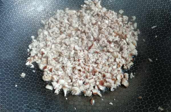 3、熱鍋倒油,放入肉末炒香後,再放入香菇翻炒一會。