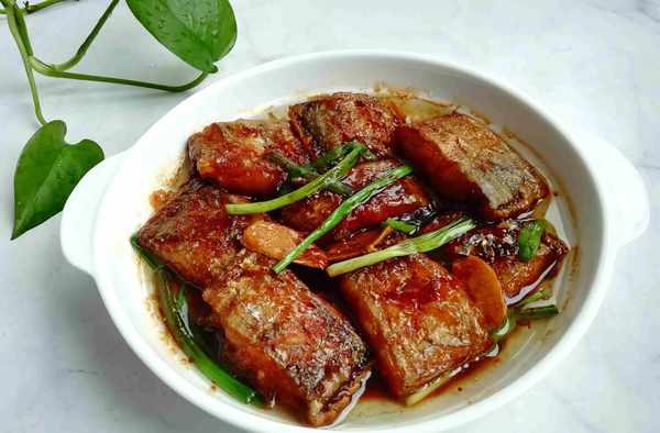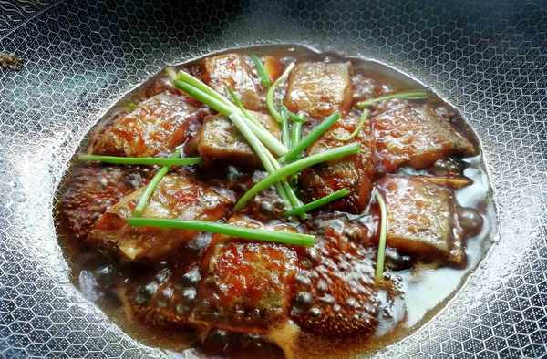 4、倒入料汁,中火燒至入味,再放入香蔥提味,香噴噴的紅燒帶魚就搞定啦!