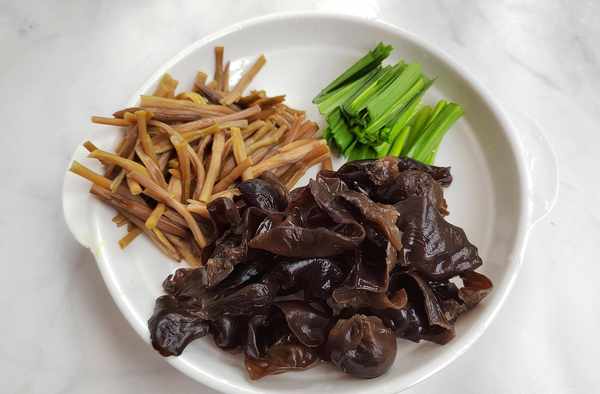 1、黃花菜和木耳分別放入溫水中泡發,清洗幹凈,放入開水鍋中,大火煮1分鐘,撈起過涼,瀝幹水備用。蒜苗洗凈,切成小段,沒有蒜苗也可以用香蔥代替。