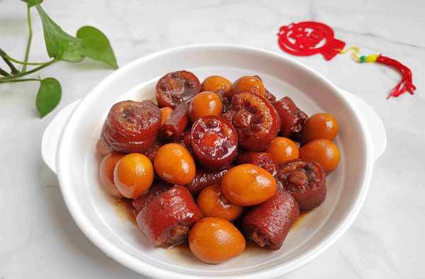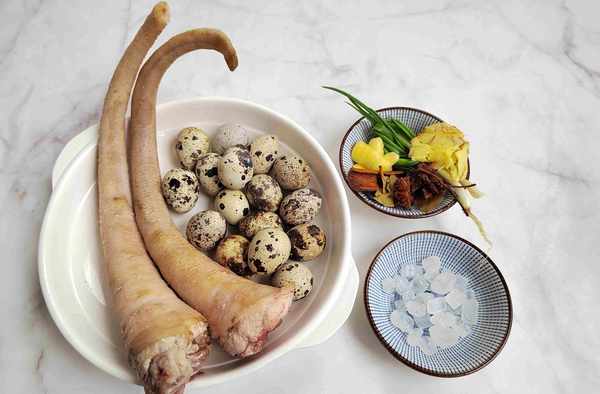 食材:豬尾巴兩條、鵪鶉蛋1把、冰糖少許、生薑兩塊、蔥結1個、八角3個、桂皮1塊、香葉3片、花生油30克、鹽3克、生抽10克、蠔油10克、料酒40克、紅燒醬油少許。