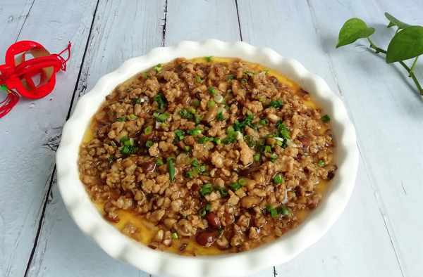 4、加入鹽、生抽、蠔油、料酒炒勻,鋪在雞蛋豆腐上,再蒸一兩分鐘,就可以出鍋啦!
