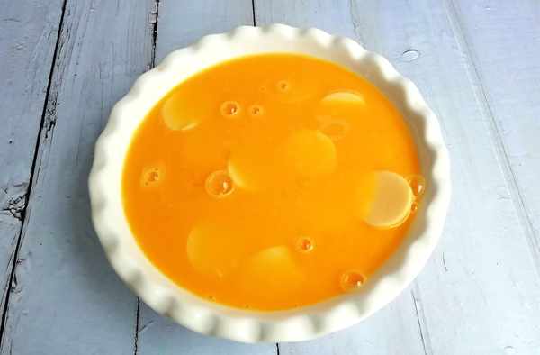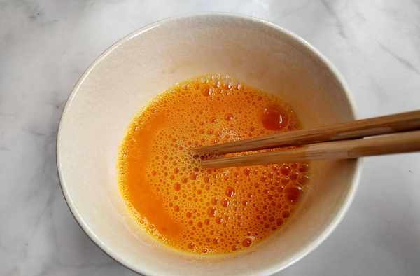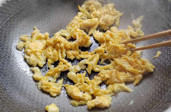 3、熱鍋倒油,燒至冒煙後,再倒入蛋液,劃散後,盛出。