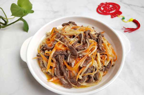 食材:胡蘿卜根、金針菇1把、牛肉1塊、鹽3克、生抽10克、蠔油10克、料酒10克、生粉3克、花生油30克。