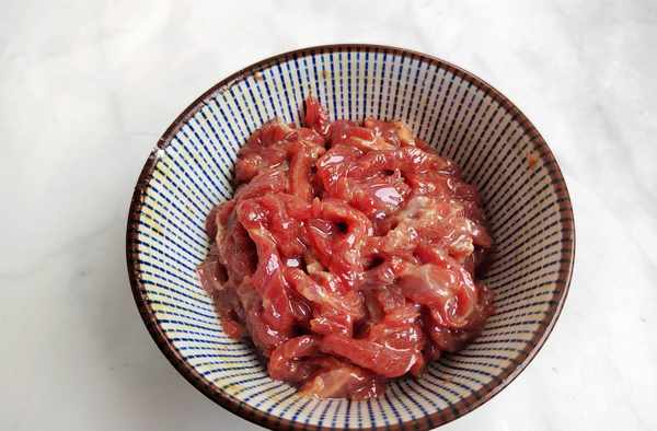 2、牛肉沖洗一遍,切成肉絲,加入生抽、料酒、蠔油生粉和少許花生油拌勻,醃制10分鐘。