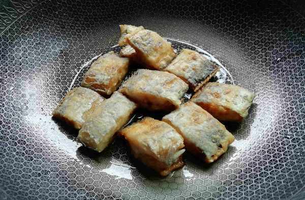 3、熱鍋倒油,放入薑片煸香,再放入帶魚煎至兩面金黃酥脆。