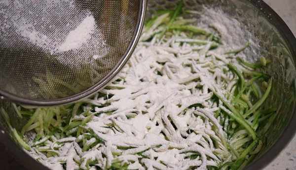 4.把適當的面粉過篩進去,面粉的話,一起不要倒太多進去,可以在倒的時候用筷子一邊攪拌一邊的倒。