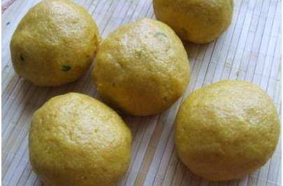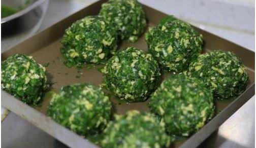 五.然後將炒熟的韭菜和雞蛋團成球,再放到混合的玉米面中滾上一圈,再蘸上一些清水之後再放到玉米面裡裹上面粉,之後每一雞蛋韭菜球都這樣弄。