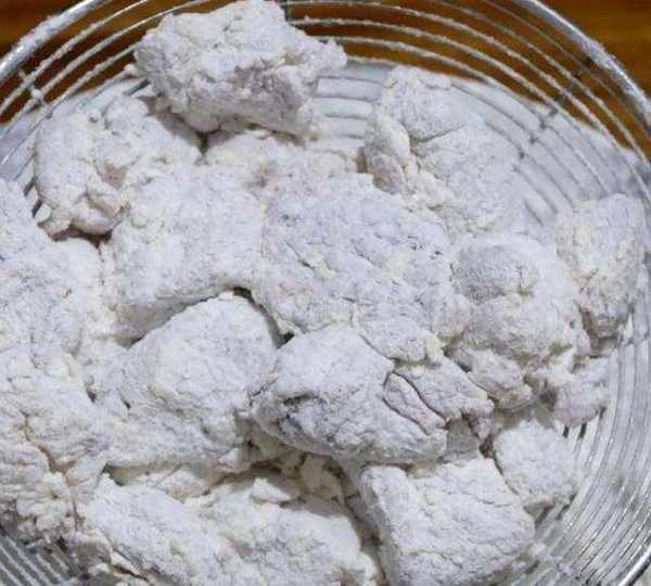 第3步、生粉和面粉各一半,將醃制好的肉丁放入粉中使其均勻的裹上一層面粉,捏成團除去多餘的粉末。