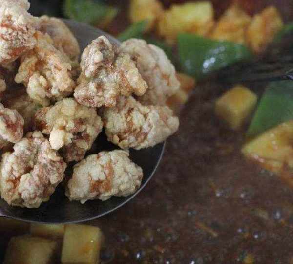 第4步、鍋裡倒適量的油燒至五成熱,肉丁放進去小火炸至變色撈出。油鍋加熱再次倒入肉丁大火炸至金黃色撈出瀝幹。