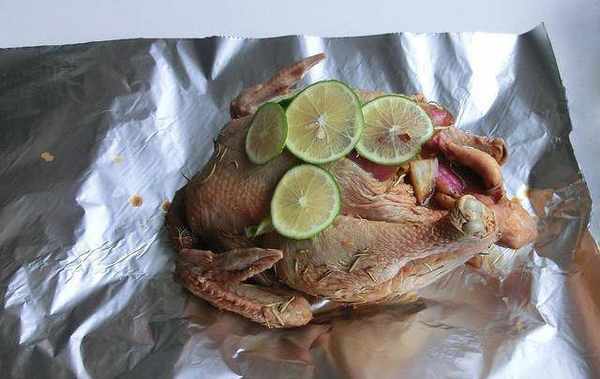 3.用橄欖油漱口雞,將雞肉醬菜放入雞腹,放入幾片檸檬,用牙簽將雞腹封好固定,用錫紙包住。
