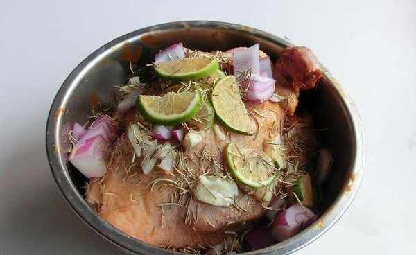 做法:1,三黃雞屠宰洗凈,去除頭、爪,將雞放入盆中,放入薑片、蒜片,擠半個青檸檬汁,然後把榨汁的青檸檬片放入盆中,迷迭香、洋蔥塊,再生提取加入烤肉醬、黑胡椒碎末、鹽均勻抓,均勻地在雞身上塗上調味汁,塗久,將雞肉充分入味。