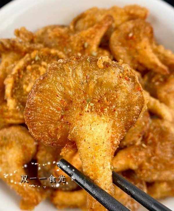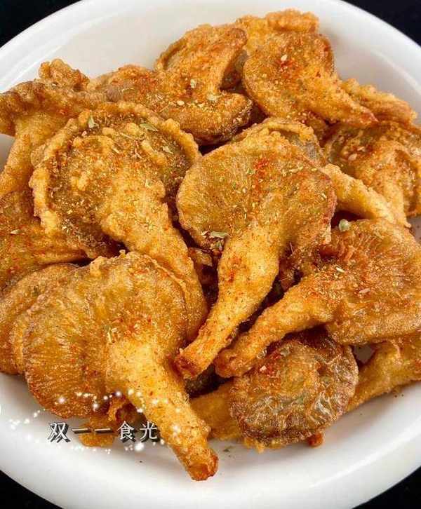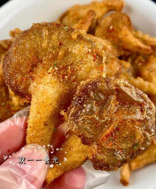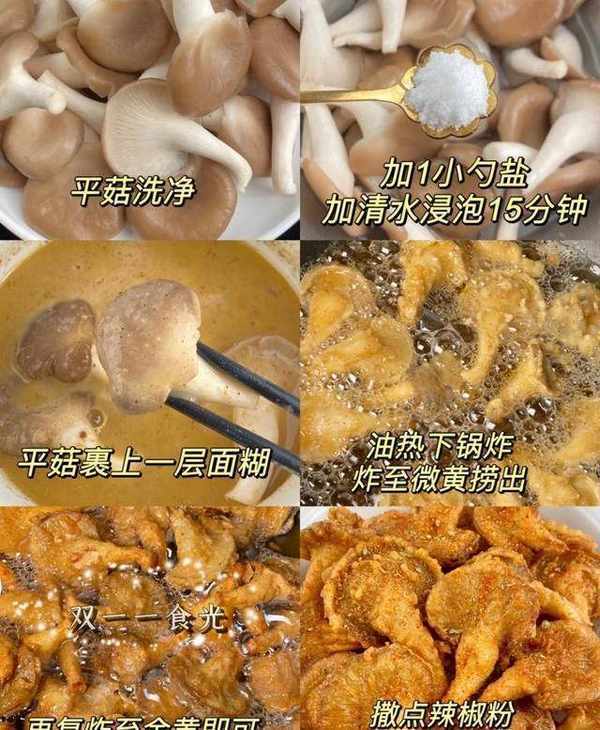 3、鍋中油熱,放入平菇,炸至微黃撈出。