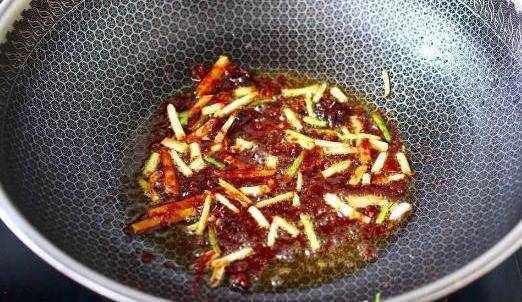第六步,炒瞭一會之後就可以把黃豆醬放到鍋中,把黃豆醬炒出紅油。