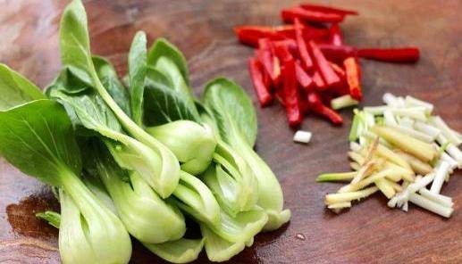 第二步,把一把小油菜都洗幹凈,然後把它一刀切一半。把紅椒裡面的籽去掉,之後就切成細條,再把蔥和薑都切成絲,弄好之後就把這些材料放好備用。