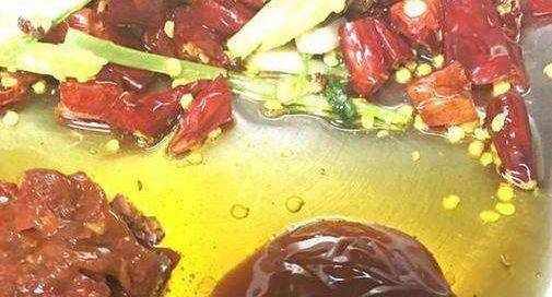 4、燒油,然如薑蔥蒜花椒,爆香。加幹辣椒,小火微炒,炒出紅油即可。