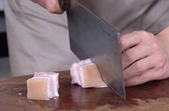2.起鍋燒水,把整塊肉放入鍋中焯一下。水中加入適量的料酒、薑片和蔥段去腥,水量要沒過豬肉。水開後撇去浮沫,繼續燉煮2分鐘。然後把整塊五花肉撈出,切成邊長約3cm左右的正方塊狀(麻將塊狀),放一旁備用。不建議先把五花肉切成小塊後再焯水,一來不容易切得方正齊整,二來肉香味容易被煮淡。