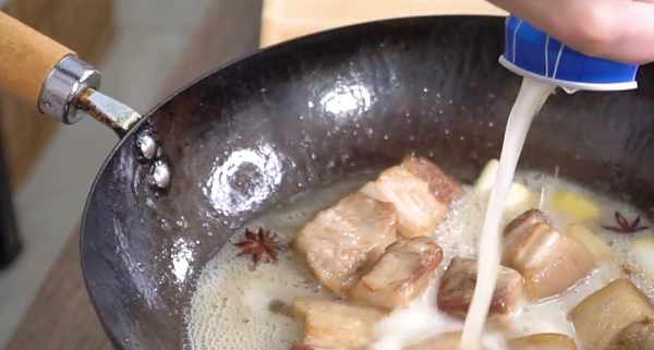 4. 鍋中倒油,油熱後把切好的五花肉塊倒入,簡單翻炒幾下,當肉塊中的油脂被炒出來時,下入蔥段、薑片、蒜瓣、幹辣椒以及香葉、八角、陳皮、桂皮等香料,炒出香味後,倒入上一步炒好的糖水繼續翻炒至豬肉塊上色。 接著倒入適量的啤酒至沒過豬肉塊,並轉為大火煮沸。之所以不用清水而改用啤酒,是因為啤酒可以去腥並增加香味。