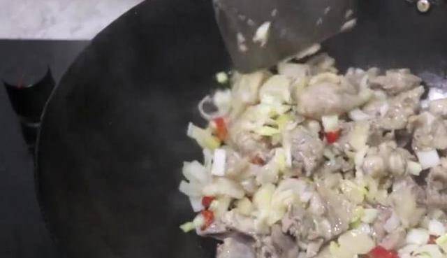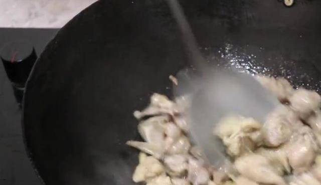 把鍋先來充分燒熱,加入油,把鍋給熱一下,油熱之後把油給倒出去。再來加入一點。就是這樣的一個情況。把醃制好的雞肉下入鍋中快速劃散。繼續來煎炒一下,把雞肉炒至斷生,大概炒三分鐘就可以瞭,把炒好的雞肉盛出來備用。