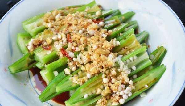 2、焯熟後過涼水裝盤,講大蒜辣椒切成碎末,放在秋葵上。