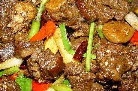 2、熱鍋起油,加入適量的油,燒至7成熱時下幹辣椒、蔥段、薑片、蒜瓣、花椒、草果、大料翻炒出香後下狗肉煸炒,再加入醬油上色,然後加入鹽、糖調味,繼續翻炒片刻盛出備用