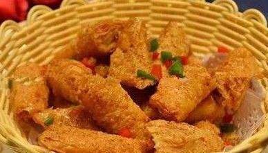 配料:凈黃魚肉400克,豆腐皮4張,香菜葉2.5克,精鹽5克,味精2克,花椒鹽5克,蔥末15克,紹酒5克,醋和茄汁醬各1小碟,幹淀粉15克,熟菜油1000克(實耗油100克)。