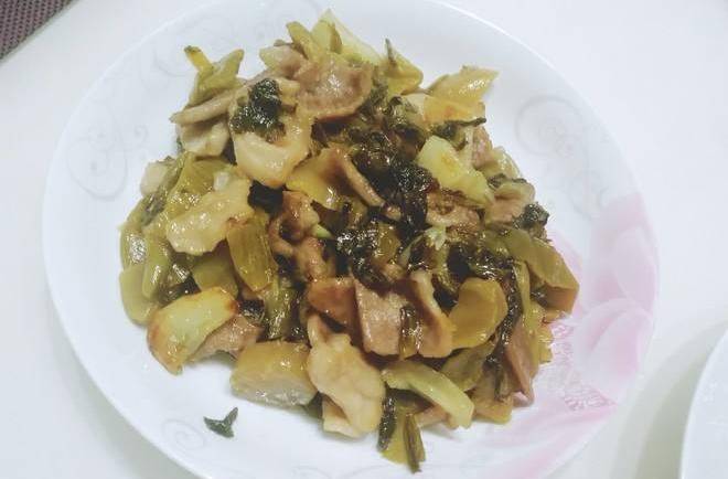 酸菜炒豬肉:酸菜用水泡半個小時,因為這次鄉下自傢曬的酸菜偏咸,豬肉切小塊,用少許料酒,醬油,生粉醃制10分鐘,熱油爆香蒜頭後,倒入豬肉炒熟,放入酸菜,最後放白砂糖翻炒片刻即可。