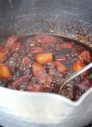 7、如果喜歡粘稠的醬汁。那就再將所有食材倒入炒鍋中收瞭一下汁。白開水兌一小勺淀粉放入鍋裡。加熱使得醬汁濃稠。如果喜歡吃稀一點的,這一步可以省略。