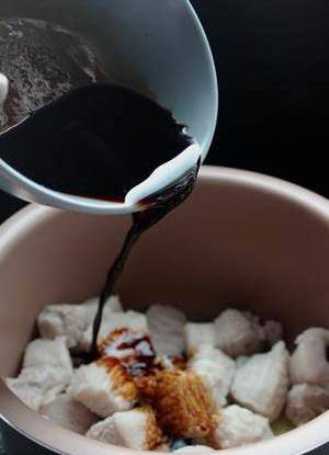 6、加入沒過五花肉的水,放入切好的一小段蔥/兩顆八角,按煮飯鍵等電飯煲自動出鍋。
