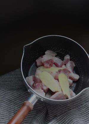 2、鍋內倒入洗好切勻稱的五花肉(切五花肉的時候可以盡量且大一點。經過烹飪之後肉質會收縮變小)。分別放入準備好的料酒和和切好的三片薑片。放入三碗冷水下鍋煮開。煮開後大約兩分鐘。