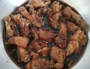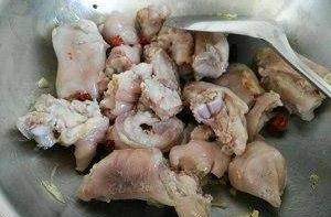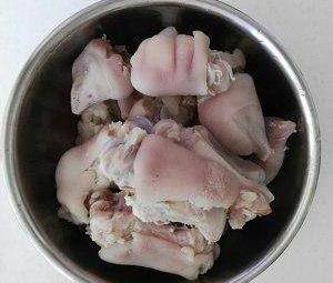 豬腳洗凈用水浸泡數小時,斬成小塊兒,放入開水中煮五分鐘後再浸泡十分鐘後撈出,用熱水洗凈血沫控水備用。