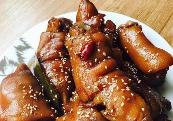 用料:豬蹄2隻、老式冰糖適量、花椒10粒、八角2個、香葉1片、桂皮1塊、蔥1根、薑5片、幹辣椒3個、料酒2勺、老抽適量、生抽適量、油適量、鹽適量