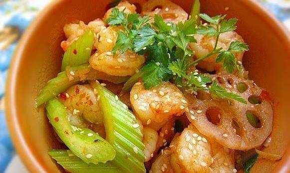 材料:虎蝦蝦仁500g、西芹200g、蓮藕1段、辣豆醬1.5大勺、白酒1小勺、糖1小勺、白芝麻1小勺、香菜1小把、蔥、薑、蒜