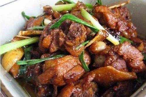 2、在鍋中倒入鵝肉,同時加入適量鹽,料酒,醬油,不斷翻炒至有肉香味,後放入少許老抽調色,並繼續翻炒使上色均勻。