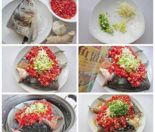 做法:1、把花鰱魚頭洗凈切兩半,不要切斷,用鹽、料酒抹均勻醃制10分鐘,蔥薑大蒜洗凈切末