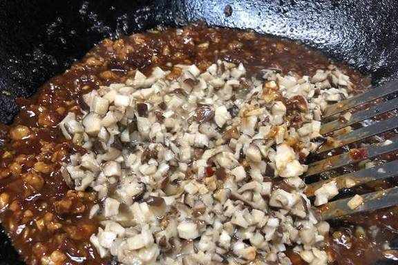 把之前過油的香菇丁加入鍋內繼續翻炒幾分鐘。