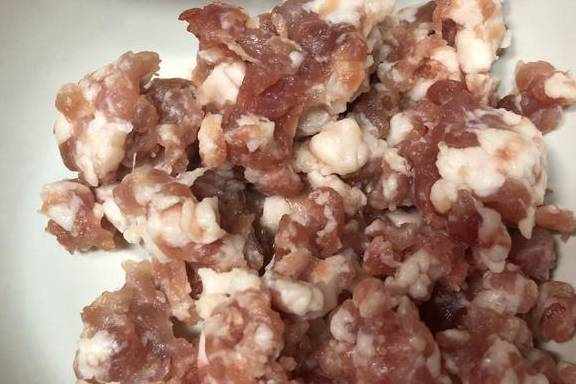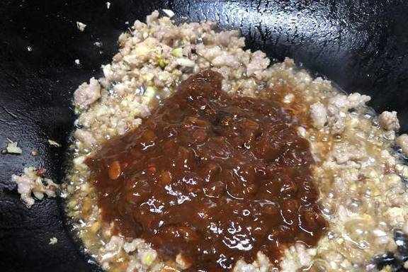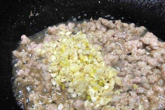 加入碎肉丁翻炒,炒出肉香味後加入蒜末和薑末進行炒。