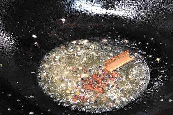 鍋內留有些許底油,加入花椒、大料、桂皮和香葉,炸出香味後撈出。