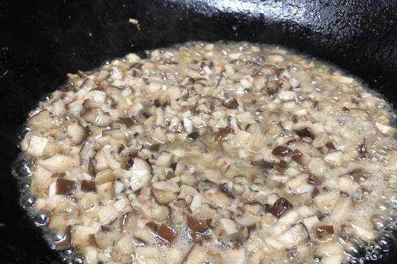 鍋內多放一些油,把切好的香菇丁先過一遍油,撈出備用。