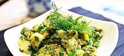 2、燒熱的鍋中倒入適量的油,倒入茴香籽的汁液,中火炒至底部成型,翻炒片刻,用鍋鏟鏟去變硬的茴香菜。把雞蛋打碎,然後把它從鍋裡拿出來放在盤子裡。