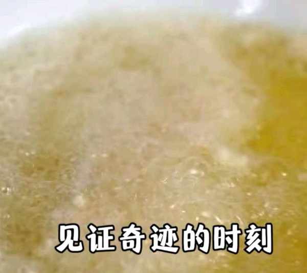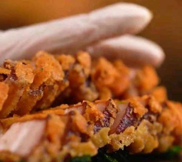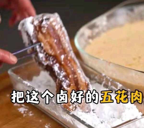 9、起鍋燒油,油溫六層熱,把五花肉放入鍋中,然後不要動,等待外面的糊衣定型後,再總筷子輕微動一下,然後再次把油溫升至六層,把五花肉放入復炸一下,炸至金黃酥脆。