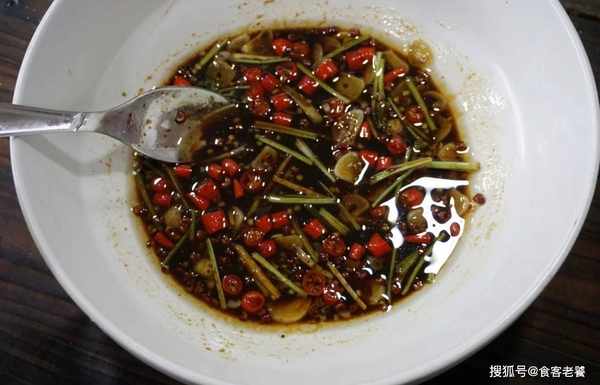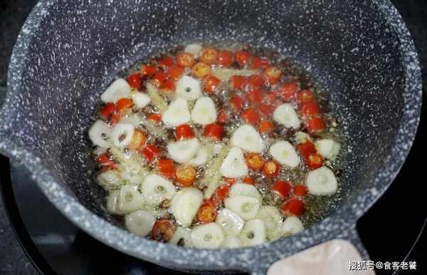 5鍋裡倒入色拉油,稍微加熱後關火。再把小米辣、生薑、大蒜、花椒放入鍋裡,讓油溫激發出材料的香味後盛入碗中。